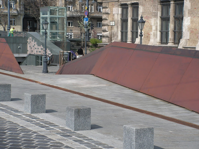 Ez már a mély belvárosi rész, itt az állomás is elég mélyen van. Itt jön elő az egyik problémám az új metróval. Olyan sűrűn vannak a megállók, hogy alig tud felgyorsulni és már meg is kell állnia. Szerintem erre jó megoldás lett volna az, hogy egy ilyen helynek (Fővámtér + Szent Gellért tér) közös megállója lett volna a Duna alatt és onnan kijáratok a két helyhez. Ha a megálló túl rövid lenne, akkor pár méter mozgó járda segített volna a vízszintes közlekedésen (bár a Kálvin térnél szerintem ennél többet kell gyalogolni a két metró közötti átszállásnál). Ugyanezt kellett volna alkalmazni a Móricz Zsigmond körtér és Újbuda megállók között is. Kb. másfél megállóval olcsóbb lett volna a dolog (azért csak ennyivel, mert azért a feljövetelt mindkét oldalon meg kellett volna oldani). A Fővámtérnél a metró bevilágítói - mert azért itt is biztosítani szerették volna a bevilágítást természetes fénnyel - a Corvinus egyetem előtt találhatóak. A másik problémám az alkalmazott anyagokkal van: miért kell rozsdásnak látszani egy új dolognak? Nekem a rozsda az elmúlást, a rossz anyagminőséget, a leszálló ágat mutatja (valahol - talán Pécsett - építettek egy acél kilátót, amelyet egészen berozsdásítottak, le kellett zárni, mert az acéllemezek össze szabdalták az embereket, a rozsda pedig összekoszolt mindent és mindenkit. Kidobott pénz, bár nem az első és nem az utolsó). Én biztosan kiirtanám ezt a módszert, vagy technikát mindenhonnan. Az állomás leglátványosabb része a mozgólépcsők felett található, ez egy több szinten elhelyezett többirányú vasbeton rácsszerkezet, amely alulról nézve igen érdekes szerkezetet mutat. Maga az állomás viszonylag szerény (mondhatni kicsi), viszont itt már alkalmazzák a mozaikot a metró szinten is, bár egyszínű felületekkel). Szerintem egy kellemes állomás.